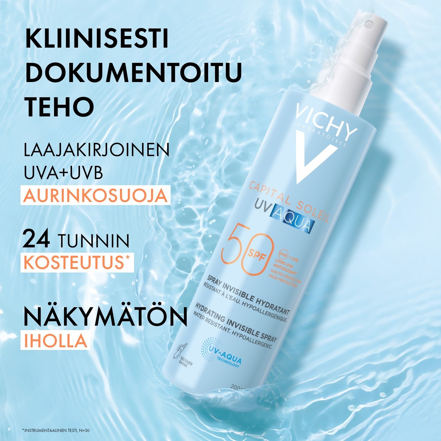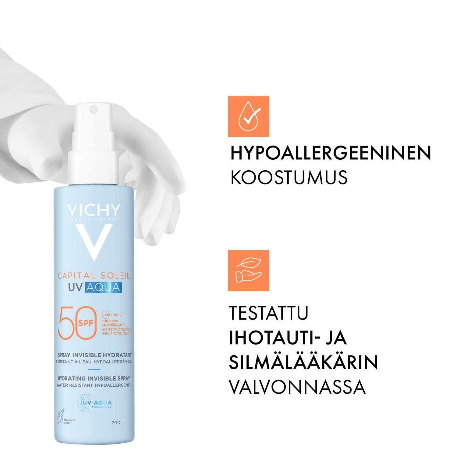 Ultrakevyt aurinkosuojasuihke vartalolle SPF50. Näkymätön iholla ja vedenkestävä.