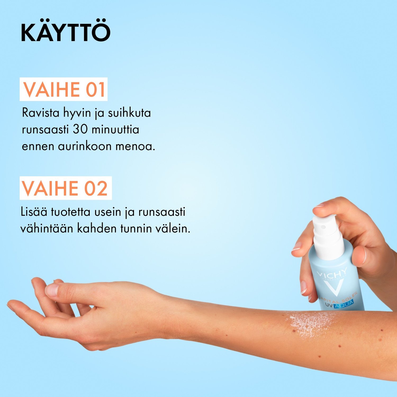 Levitä tuotetta usein ja runsaasti, vähintään kämmenellinen, suojatehon säilyttämiseksi erityisesti uimisen, hikoilun tai kuivaamisen jälkeen.