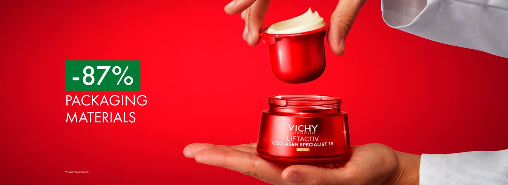 VICHYN RATKAISU: COLLAGEN SPECIALIST 16 -PÄIVÄVOIDE SPF50 ja sen sisältämä Co-Bonding-teknologia: [Ramnoosi + Peptidit + Maitake] tukee kollageeniaan menettänyttä ihoa + [SPF50] suojaamaan ihoa päivittäiseltä auringolle altistumiselta.