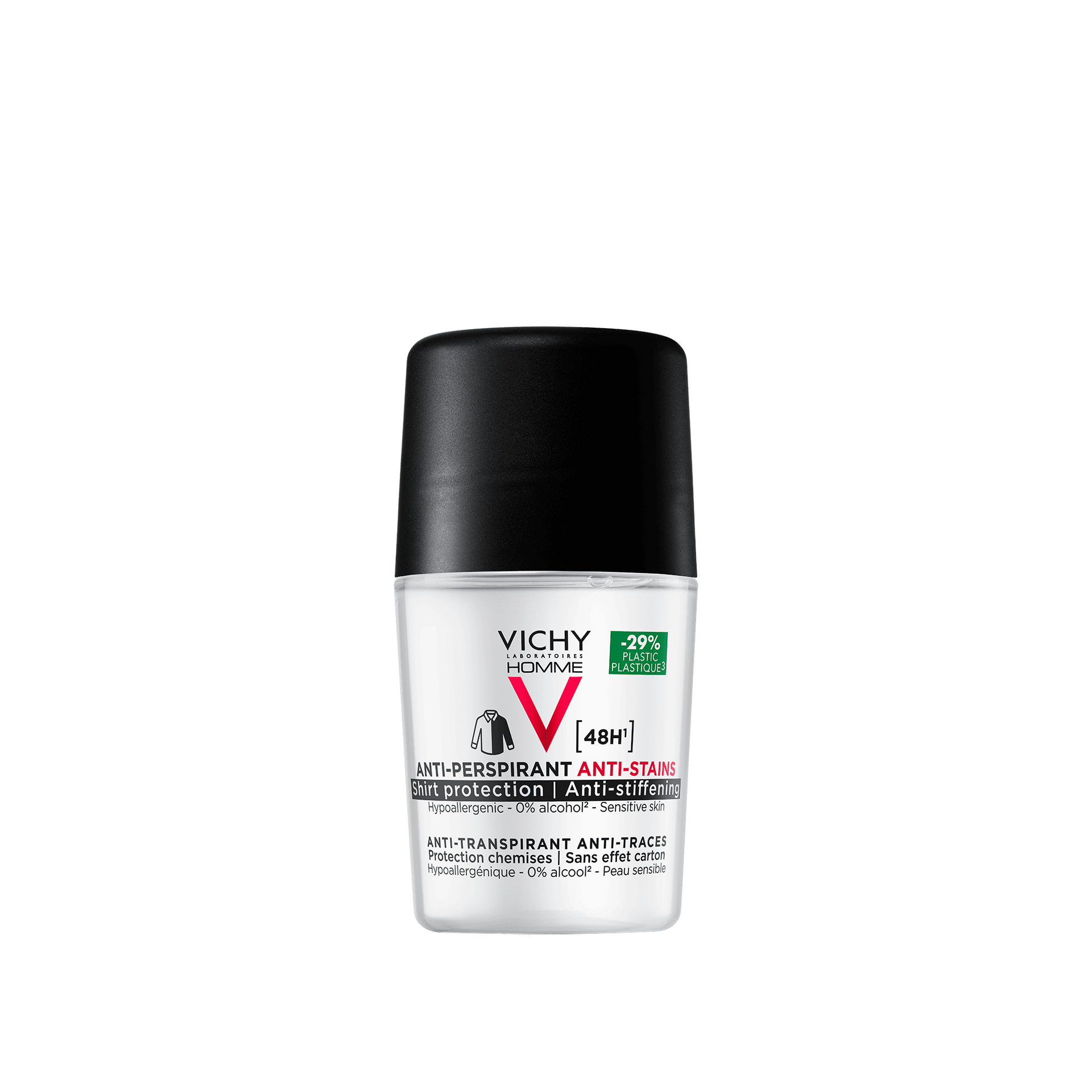 Vichy Homme antiperspirantti 72h roll-on voimakkaaseen hikoiluun antaa pitkäkestoisen vaikutuksen ja sopii myös herkälle iholle. Tämä deodorantti sisältää Vichyn vulkaanista vettä, ja sitä voidaan käyttää päivittäin kuivalla iholla suihkun jälkeen.